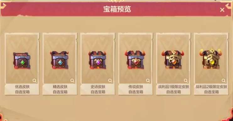 宝箱共计7个等级,等级从低到高依次为:初始宝箱、优选皮肤自选宝箱、精选皮肤自选宝箱、史诗皮肤自选宝箱、传说皮肤自选宝箱、战利品1级限定皮肤自选宝箱、战利品2级限定皮肤自选宝箱。
