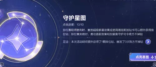 A版本主题开放首日,守护之星开启,与守护之星关联的“守护星图”、“奖励星图”和“巅峰星图”,这3张对应排位模式的星图也随之解锁。