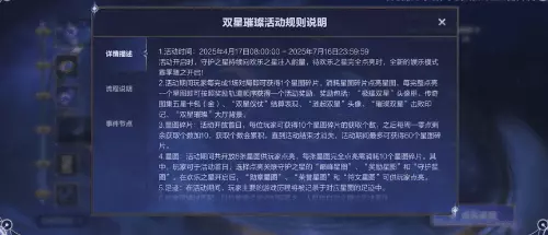 消耗星图碎片可逐步点亮星图,每完整点亮一个星图,即可根据轨道顺序获取如头像框-极耀双星、传奇图集五星卡包(金)、结算表现-双星仪仗、头像-涟起双星、击败印记-璀璨双星,以及大厅背景-双星璀璨等活动奖励。