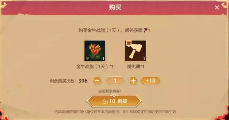 消耗10点券购买1个金牛战旗(1天)可额外获赠1个强化锤,活动期间限购396次。