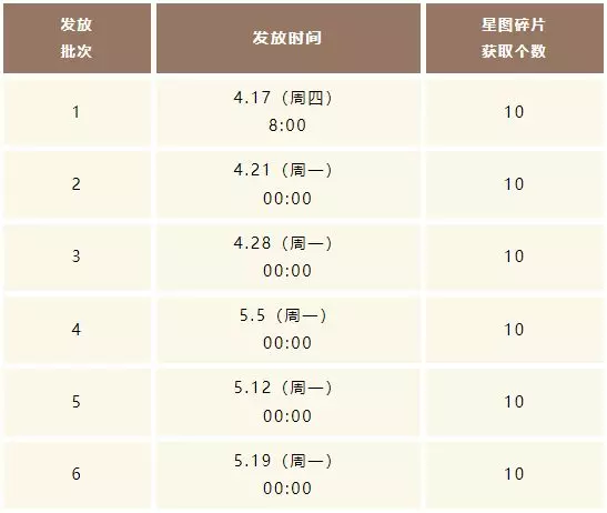 星图碎片的获取个数会累积,直到版本主题结束才会消失,主题期间最多可获得60个星图碎片,具体发放日期如下: