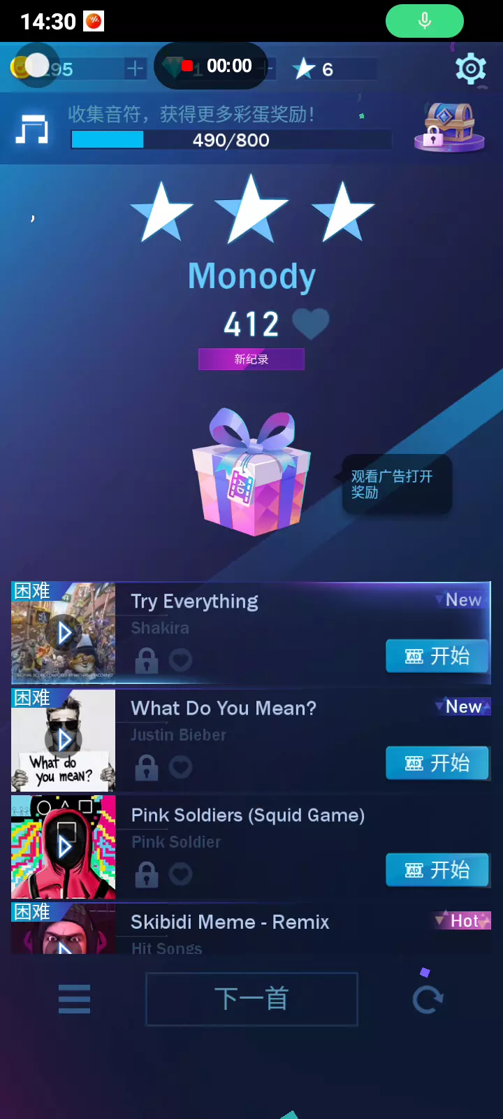 温馨提示: 每日签到免费领取500金币!获取一首你喜欢的歌! 支持自定义歌曲!快来导入你喜欢的歌曲吧! 【游戏简介】 1. 这个游戏完美融合了钢琴音乐,您可以感受到冰与火的碰撞,沉迷于世界各地的热门歌曲!感受钢琴曲! 2. 演奏方法:与其他钢琴游戏类似,连续轻敲砖块以跟随音乐的旋律~注意不要错过任何一块瓷砖。向大家证明您的演奏速度和准确性吧! 3. 此外,这里还有众多不同的专辑和各种风格的歌曲。 4. 炫酷的设计和图形。
