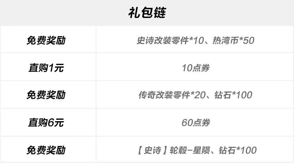 参与礼包链活动,按顺序解锁礼包,不仅有等额点券返还,更能获得【史诗】轮毂-星陨、钻石、改装零件、热湾币好礼!