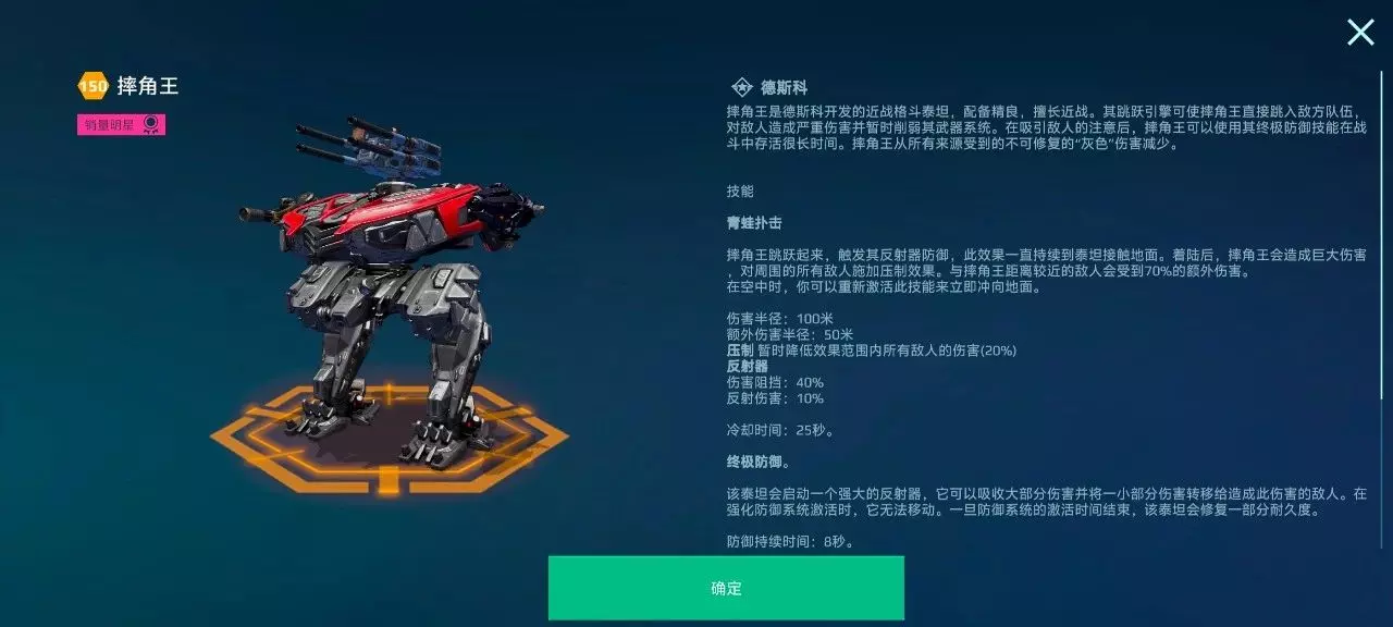 作为最早登场的泰坦之一,[摔角王]在竞技历程中始终保持着对抗主流泰坦的强大竞争力。满配[摔角王]的面板耐久可轻松逾越百万,搭配自带的35%灰伤减免、170点防御点数,以及关键时刻能够提供80%伤害吸收的“终极防御”系统,使其成为当前生存能力最强的泰坦之一。