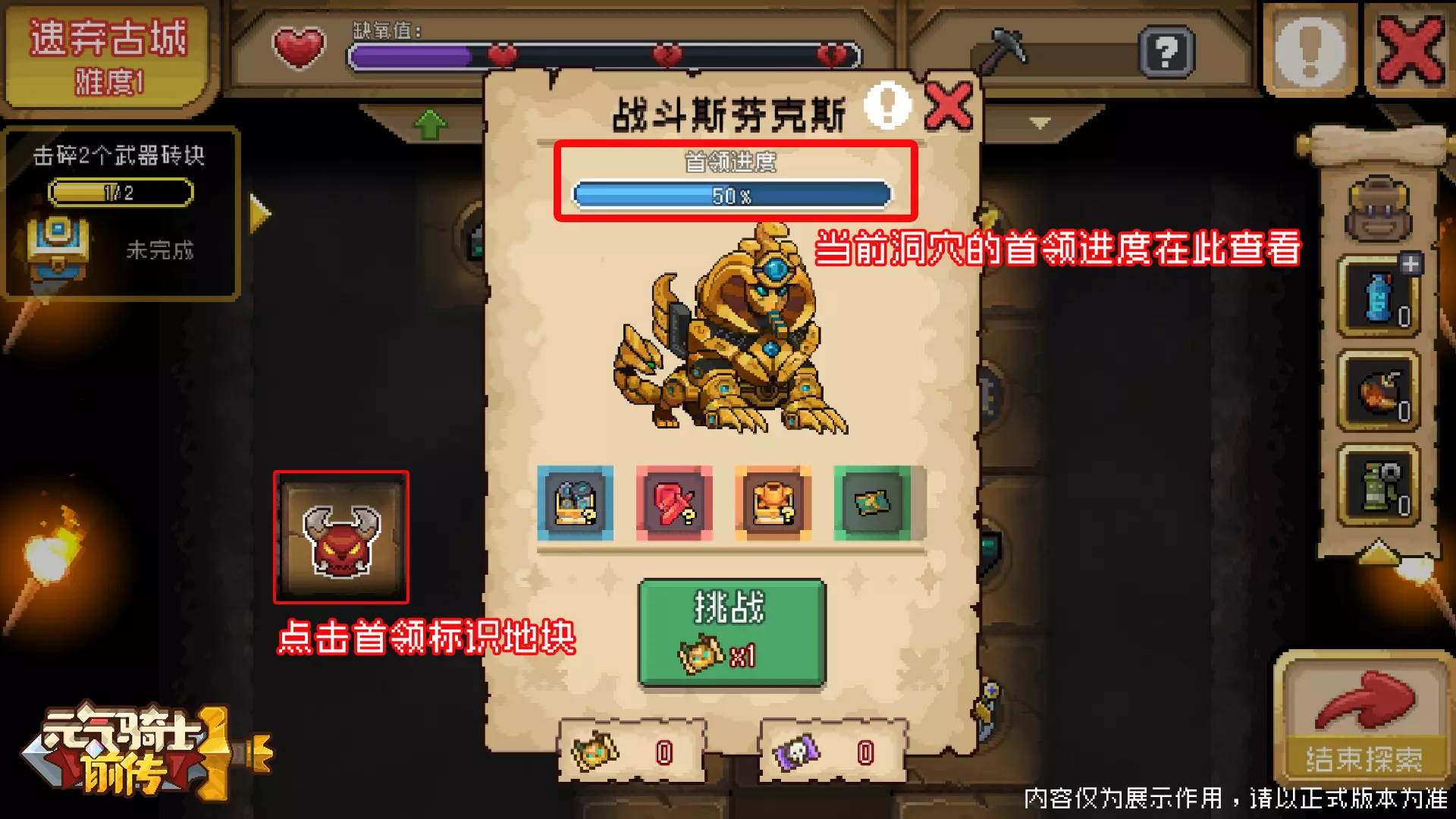 挑战Boss需要消耗首领进度(挖掘宝藏砖块积攒)或首领挑战券(洞穴掉落、沙漠商人处购买),击败Boss将会掉落新部位装备、新增传奇装备和升阶石等稀有奖励!