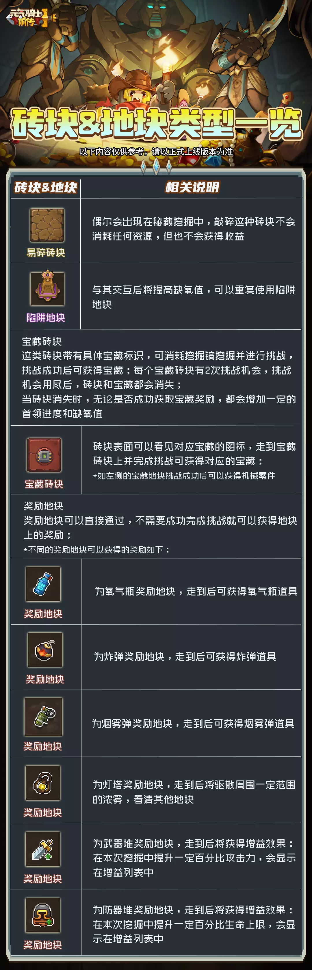 除上述各类奖励地块外,玩法内还有隐藏奖励地块,小骑士们探索到此地块时可以直接获得奖励!隐藏奖励地块中有星辉石、宝箱钥匙,卡包券、祈愿石板、可塑券等丰富奖励,不要错过哦!