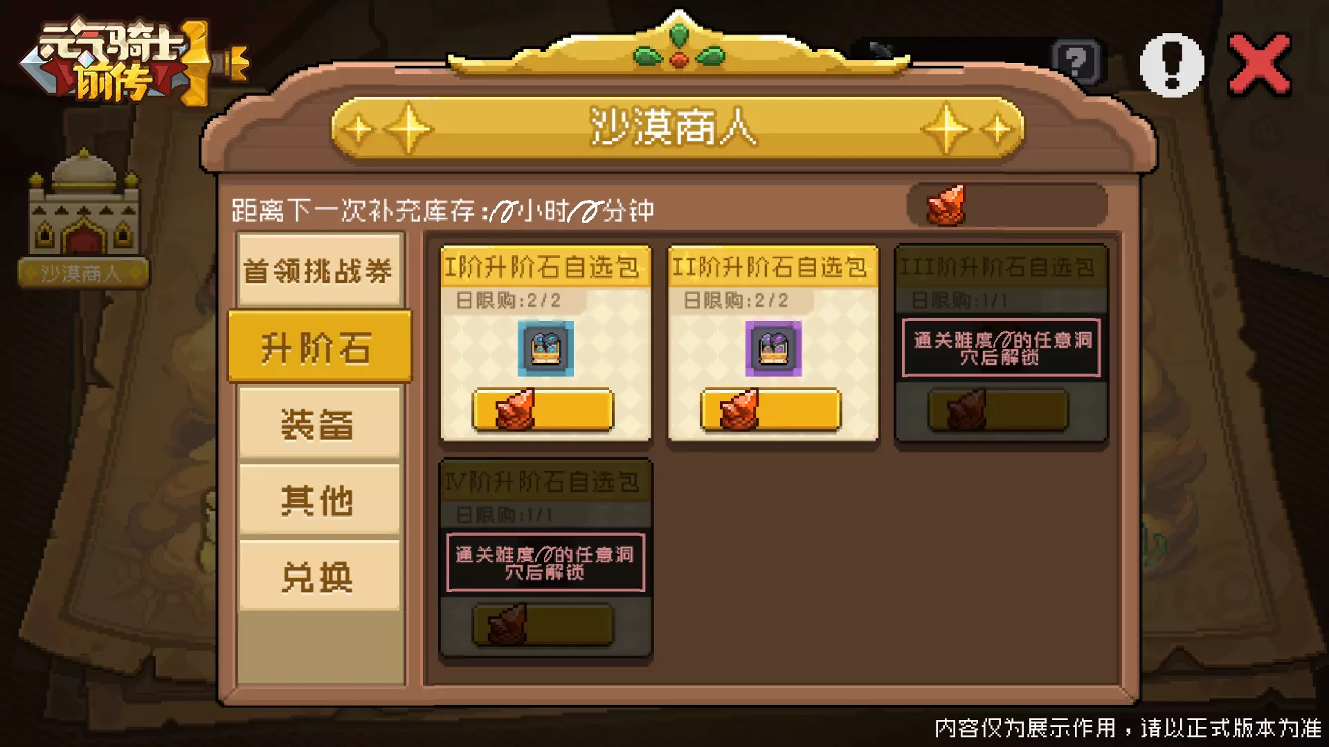 矿晶可以用来购买【沙漠商人】处的商品,商品分为每日补充的商品和每周补充的商品: