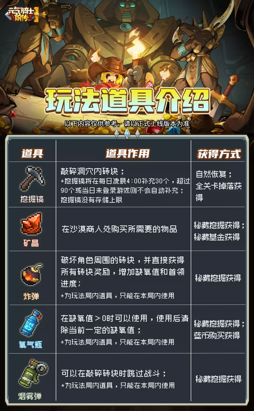 当达到特定缺氧值时,洞穴特性将会生效,部分砖块还将获得增幅标记,拥有增幅标记的砖块将提供额外的奖励;若重新挖掘另一个洞穴时,缺氧值将会重置。