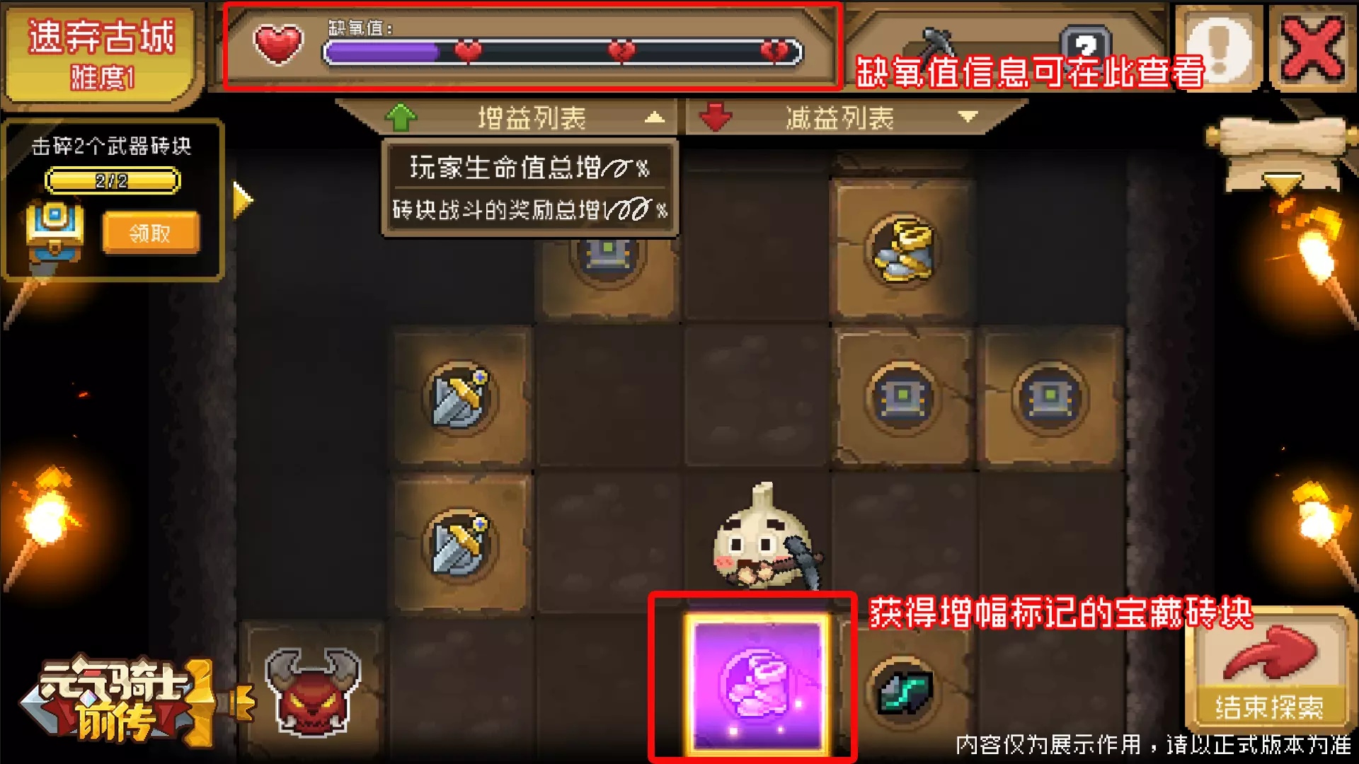 小骑士在进入洞穴后,敲碎任意砖块时将会获得缺氧值。随缺氧值上升,秘藏挖掘中的魔物将会变得更加强大,但获得的奖励会增多。