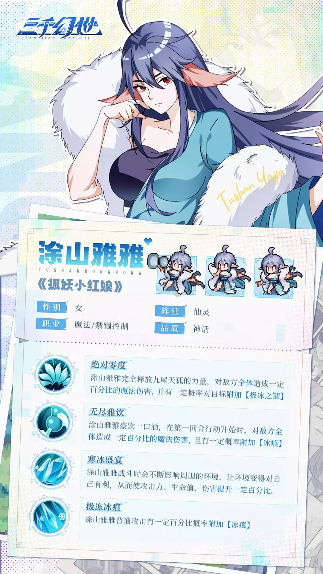 涂山雅雅完全释放九尾天狐的力量,对敌方全体造成一定百分比的魔法伤害,并有一定概率对目标附加【极冰之锢】