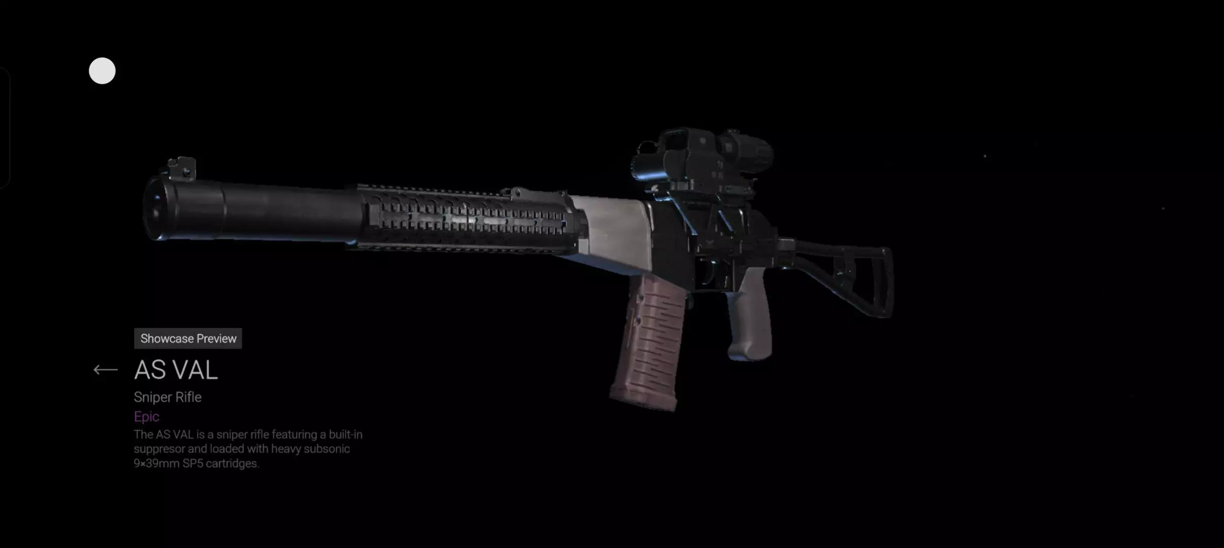 AS–VAL“绞丝机”突击步枪,游戏中将其归类到了狙击步枪中,这一点很奇怪,游戏中加装了EXR2全息瞄具型组合镜,护木导轨型号未知。