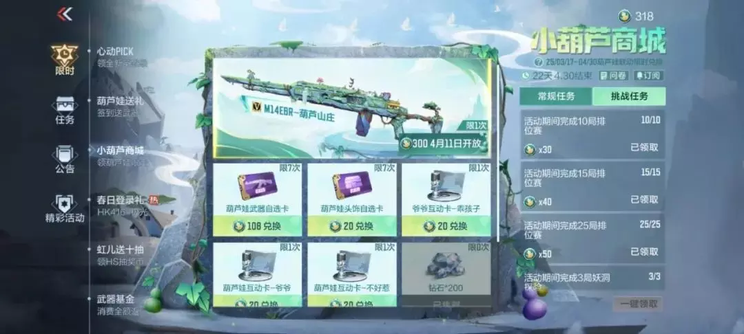 盼星星,盼月亮,M14EBR-葫芦山庄终于开放兑换了!场景塑造生动有趣,爷爷的小屋与葫芦藤上的“七个瓜”能否唤醒你的童年记忆?M14EBR-葫芦山庄的独特“老寒腿”技能可以在一定范围内触发命中减速,并且该武器拥有出色的射速与不错的伤害,相信你一定喜欢!