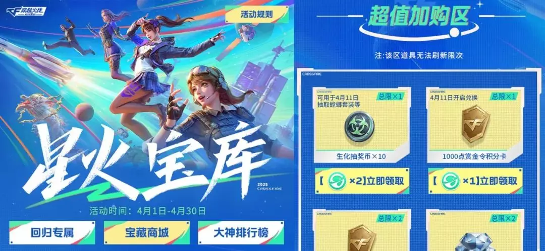 大家参与4月星火宝库已经有好几天了,不要错过宝库中的钻石和王者之骰等日常道具哦~这里强调一下,超值加购区限时加码,新增了生化抽奖币x10和1000点赏金令积分卡,需要参与生化夺宝-集结或赏金令冲级活动的话,记得留意超值加购区~