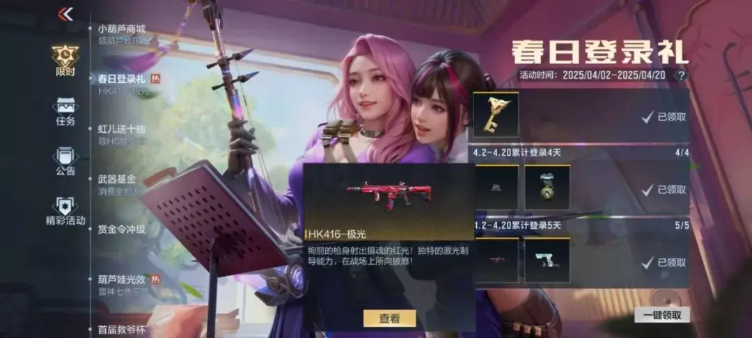 登录签到即领首发武器HK416-极光!邪神联动系列AN94-游戏主播、高爆手雷-狙击高手等返场武器也已就位,更有1500钻石+1英雄之钥助阵。春日登录礼活动仍在继续,还没参与的看官要抓紧时间了~