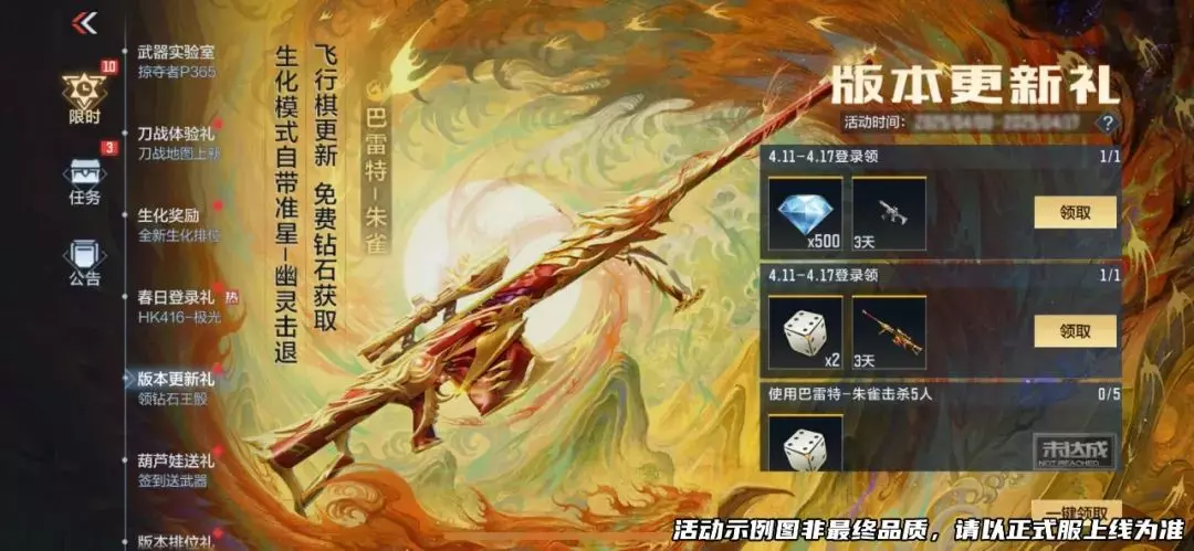 版本更新后登录即可领取500钻、王者之骰x2,攒起来总会有用武之地的。另外,在版本更新礼活动中还可以领取到巴雷特-朱雀(3天)和DDM4-PDW-星际宇航觉醒(3天),一起来体验新武器!