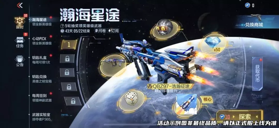 每日任务轻松完成,收集星途币可参与奖励打造,丰富奖励等你来拿。5月1日开放最后一轮奖励打造,届时即可解锁英雄级版本的QBZ97-浩瀚征途。QBZ97-浩瀚征途是一款独特的步枪,点射稳定性提升带来不错的射击体验;特殊技能是静步移速小幅提升,在爆破模式中有奇效哦~