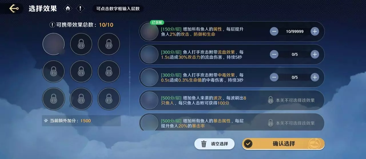 活动内容:活动期间,玩家可自定义关卡难度,应对不断来袭的鱼人。在挑战鱼人关卡前,玩家可先选择关卡内敌人的额外效果,额外效果可改变关卡内敌人的属性、数量、种类、伤害等,还可提高通关时的最终得分。玩家可带入关卡内的效果种类和数量,会随着历史最高通关得分的增长逐渐解锁。