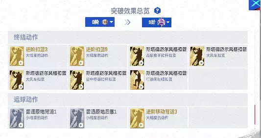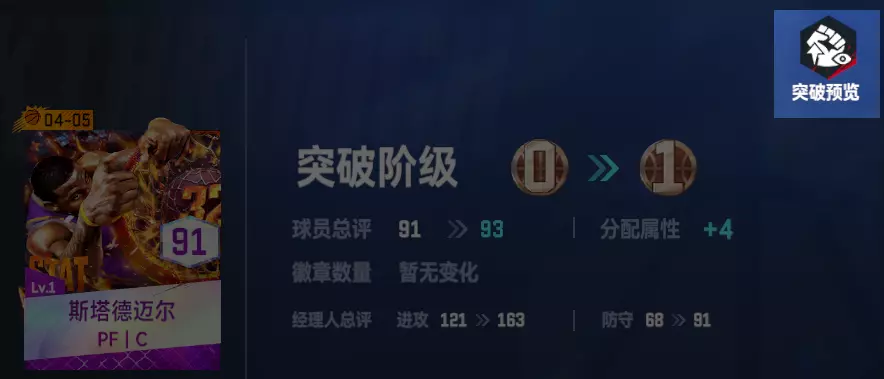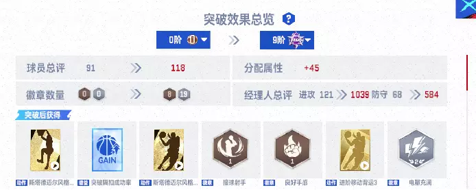 【球员突破优化】突破界面新增「球员突破预览」功能,Boss们可直观查看球员突破阶级之间的效果展示。(突破后总评、分配属性、徽章、动作、增益变化等)