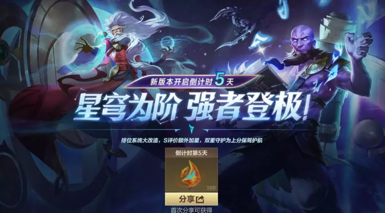 新版前瞻,分享有礼!排位系统大改造,S评价额外加星,双重守护为上分保驾护航~召唤师今日前往游戏页面,参与分享即可获得龙魂水晶*100好礼~
