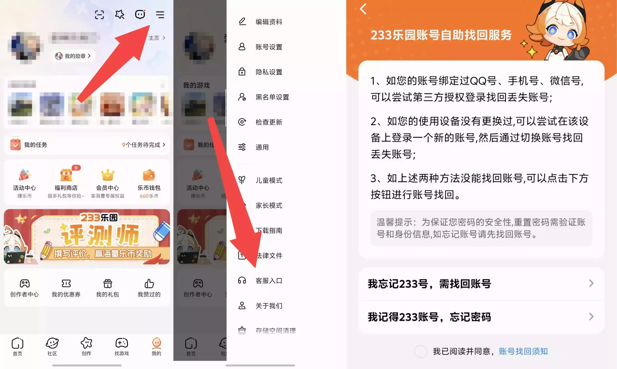1.前往233乐园账号自助找回服务:打开乐园→点击我的页面→右上角☰按钮→找到客服入口→找回账号/密码