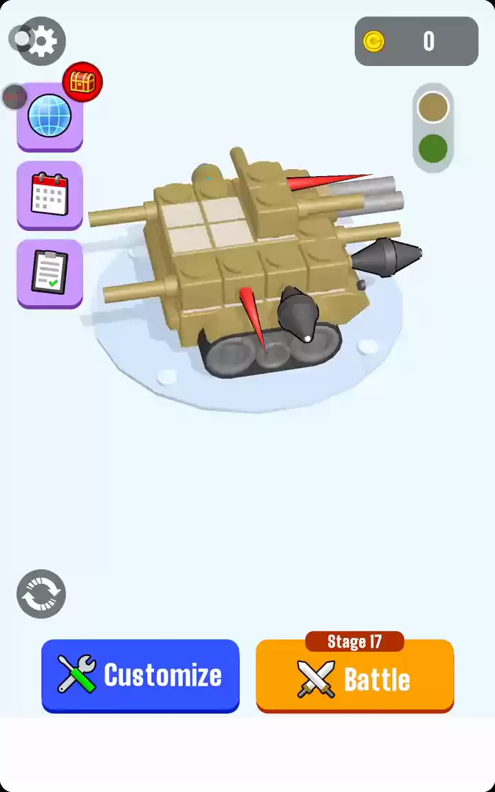 随意将大炮连接到您的坦克并击落敌人! 您可以建造一座装满大炮的塔,也可以在其上放置大量尖刺进行混战! 像塔一样完成你的坦克!