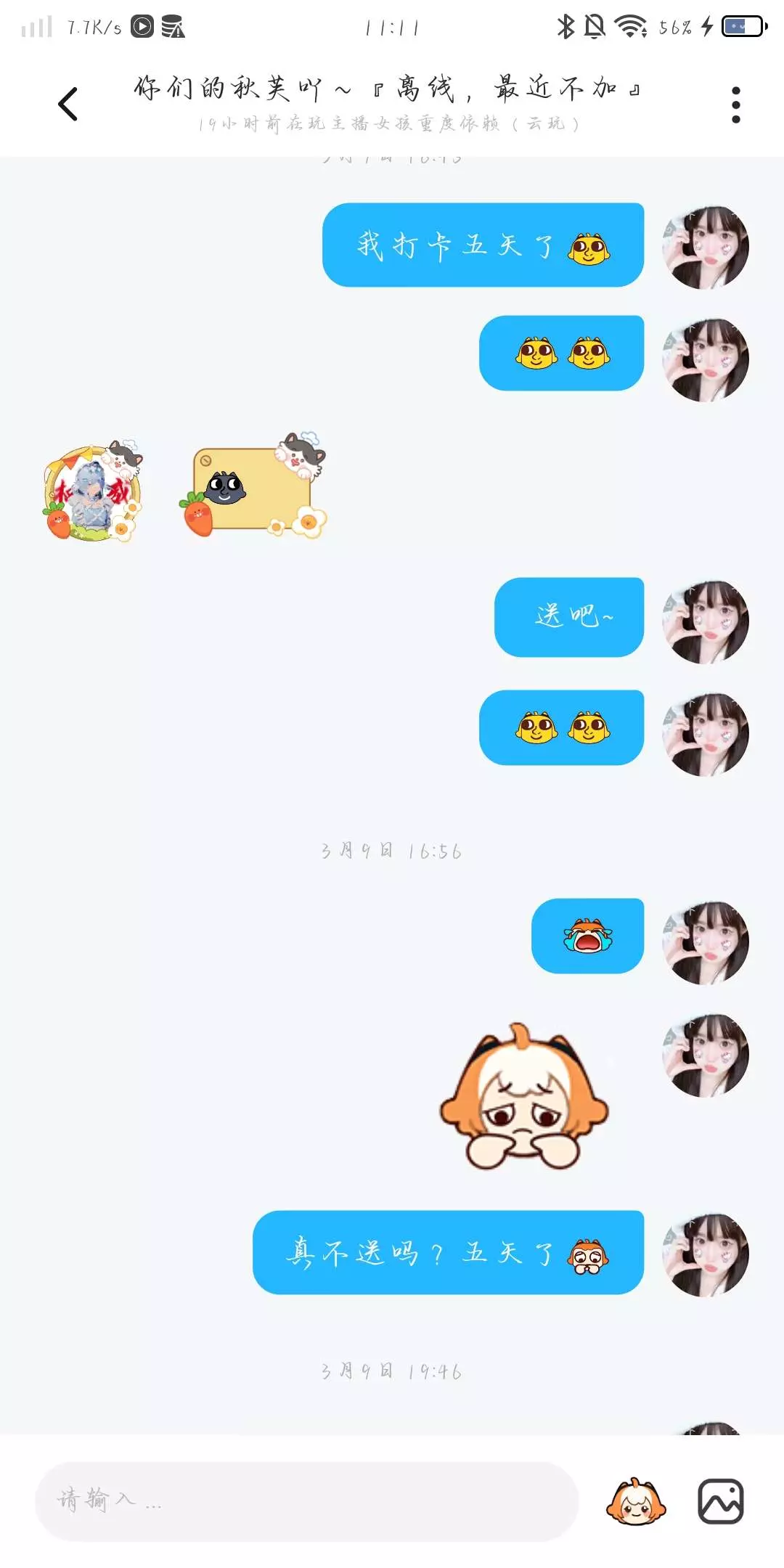 秋秋你说爱粉的,我打卡好几天了她也没送礼,是你不喜欢粉粉了吗?