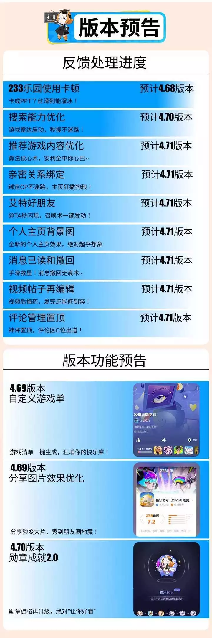 233乐园四点六八版到四点七一版本的更新公告爆料图发给你们,你们自己敬请期待吧!
