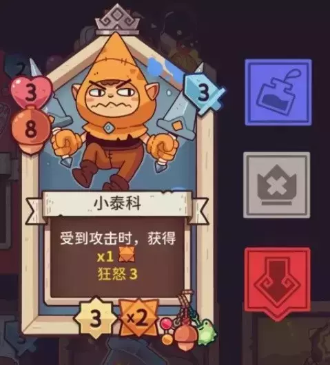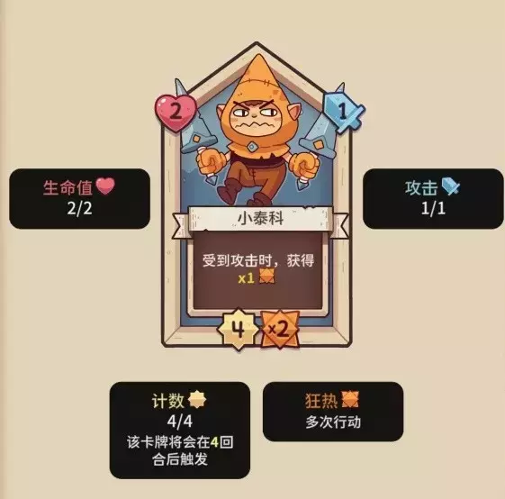 所以说,当你的卡牌基础足够好时,挂上对应的强化饰品,能使它强化到一个相当恐怖的程度。比如这张小泰科,本身是拥有受到攻击后,每次行动加一次狂热的词条,奈何身材太差。