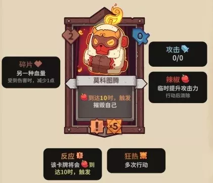 【莫科图腾】2碎片,0攻击,5狂热,反应(辣椒达到10触发,摧毁自己)