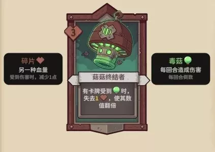 【菇菇终结者】3碎片,有卡牌受到毒菇时,失去1碎片,使其数值翻倍