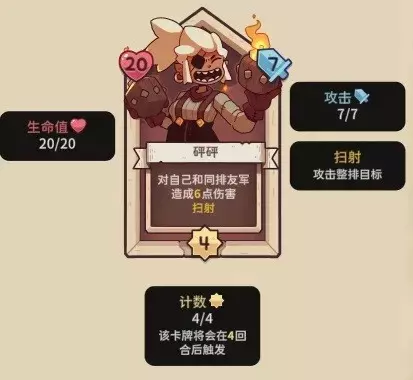 【砰砰】20血,4行动计数,7攻击力,扫射,行动时对自己和同排友军造成6伤害。