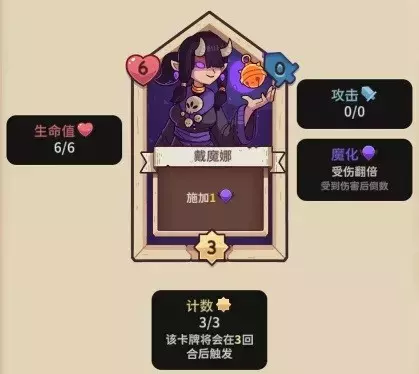 【戴魔娜】6血,3行动计数,0攻击力,行动时施加1魔化。
