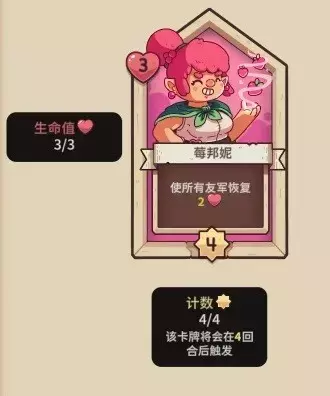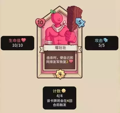 【莓壮壮】10血,4行动计数,5攻击力,击杀时同排(含自己)恢复2。