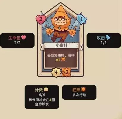 【小泰科】2血,4行动计数,1攻击力,狂热2,受到攻击时,获得1狂热。