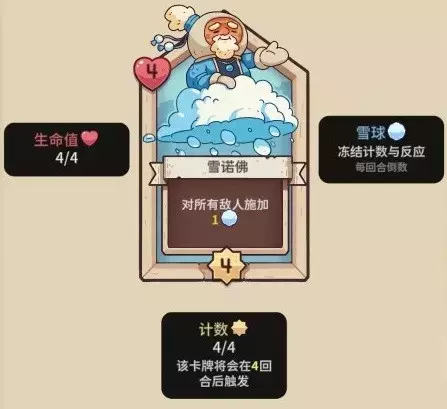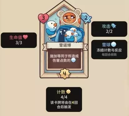 【雪诺博】3血,4行动计数,2攻击力,行动时,造成多少点伤害,就施加多少层雪球