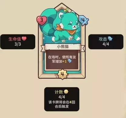 【小熊猫】3血,4行动计数,4攻击力,在场时,所有友军+1攻