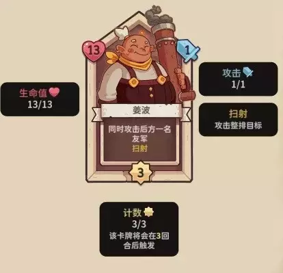 【姜波】13血,3行动计数,1攻击力,扫射,行动时同时攻击后方一名友军