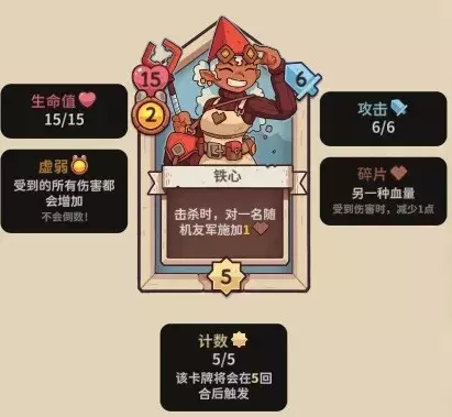 【铁心】15血2虚弱,5行动计数,6攻击力,击杀后,增加随机1木疙瘩1点碎片