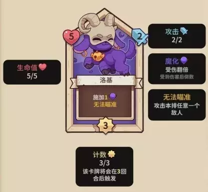【洛基】5血,3行动计数,2攻击力,行动时施加1魔化,无法瞄准