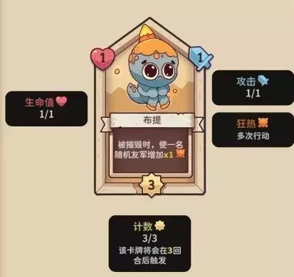 【布提】1血,3行动计数,1攻击力,被摧毁时,随机使得1友军增加1狂热。