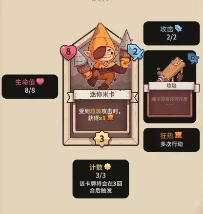 【迷你米卡】8血,3行动计数,2攻击力,被垃圾攻击时,获得1狂热。