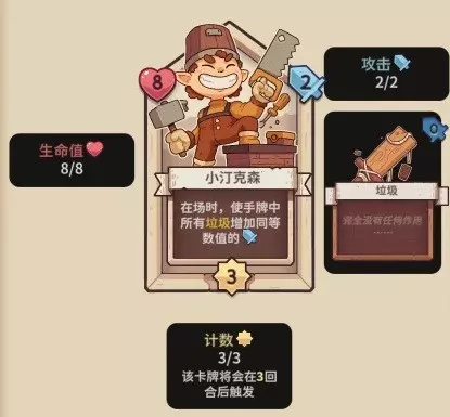 【小汀克森】8血,3行动计数,2攻击力,在场时,垃圾增加等同于小汀克森攻击力的攻击