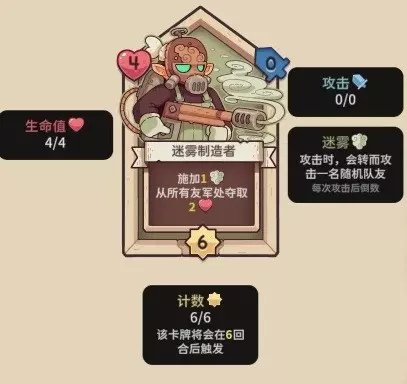 【迷雾制造者】4血,6行动计数,0攻击力,施加1迷雾,从所有友军处夺取2生命。
