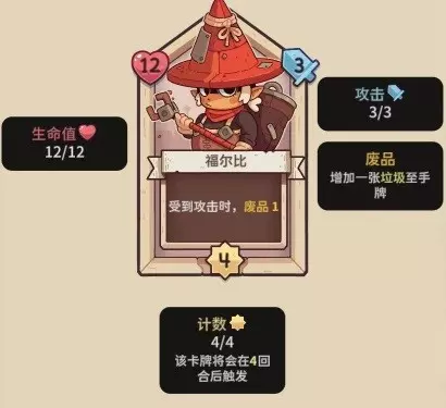 【福尔比】12血,4行动计数,3攻击力,收到攻击时产生1废品。