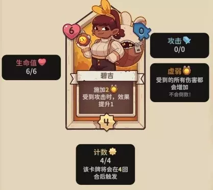 【碧吉】6血,4行动计数,0攻击力,施加2+X虚弱,X为被攻击次数