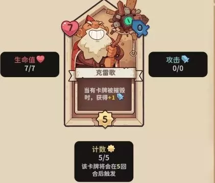 【克雷歌】7血,5行动计数,0攻击力,有卡牌被摧毁时,+1攻击力