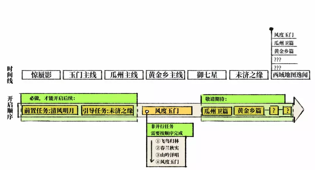 作为一个优秀的传送驿使,我为少侠们准备了一张完整的时间表,少侠们将跟随着表中的时间线开启不同时段的故事,一图在手,西域之行不迷茫!