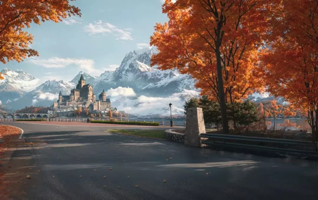 最终抵达山脚下被枫林簇拥的童话小镇