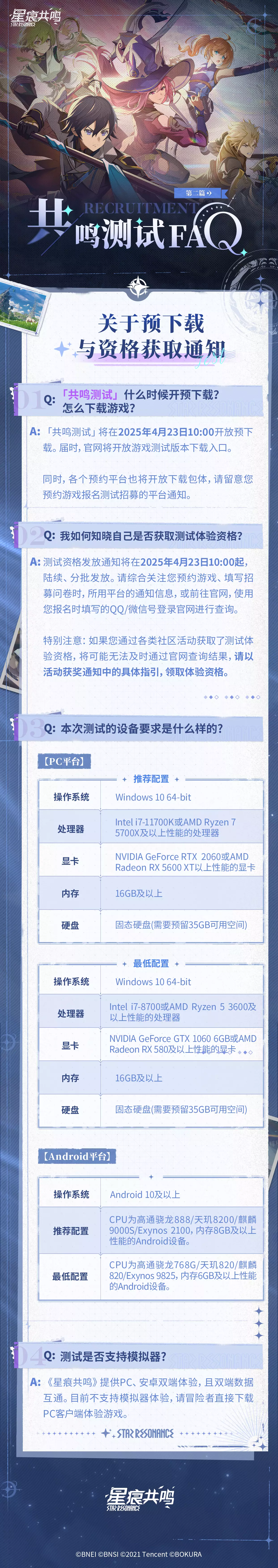 「共鸣测试」招募问卷的收集工作将于4月20日 23:59结束,继而进入问卷筛选阶段。预下载将于2025年4月23日 10:00起,陆续、分批发放测试资格通知,并开放官网查询通道。