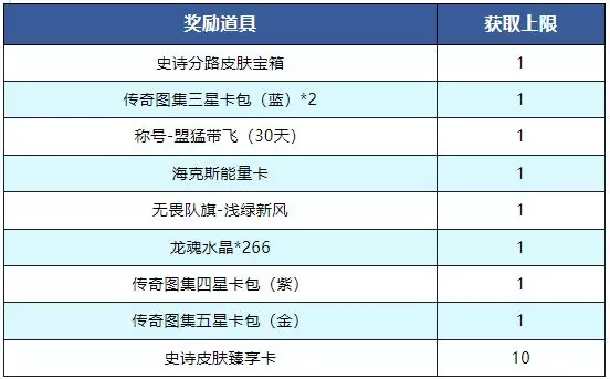 史诗分路皮肤宝箱(活动期间仅限获得1次该奖励,5月1日已获得则无法重复获取)、史诗皮肤臻享卡、全英雄畅玩卡、3胜双倍经验卡、3胜双倍晶石卡、团队胜利加成卡